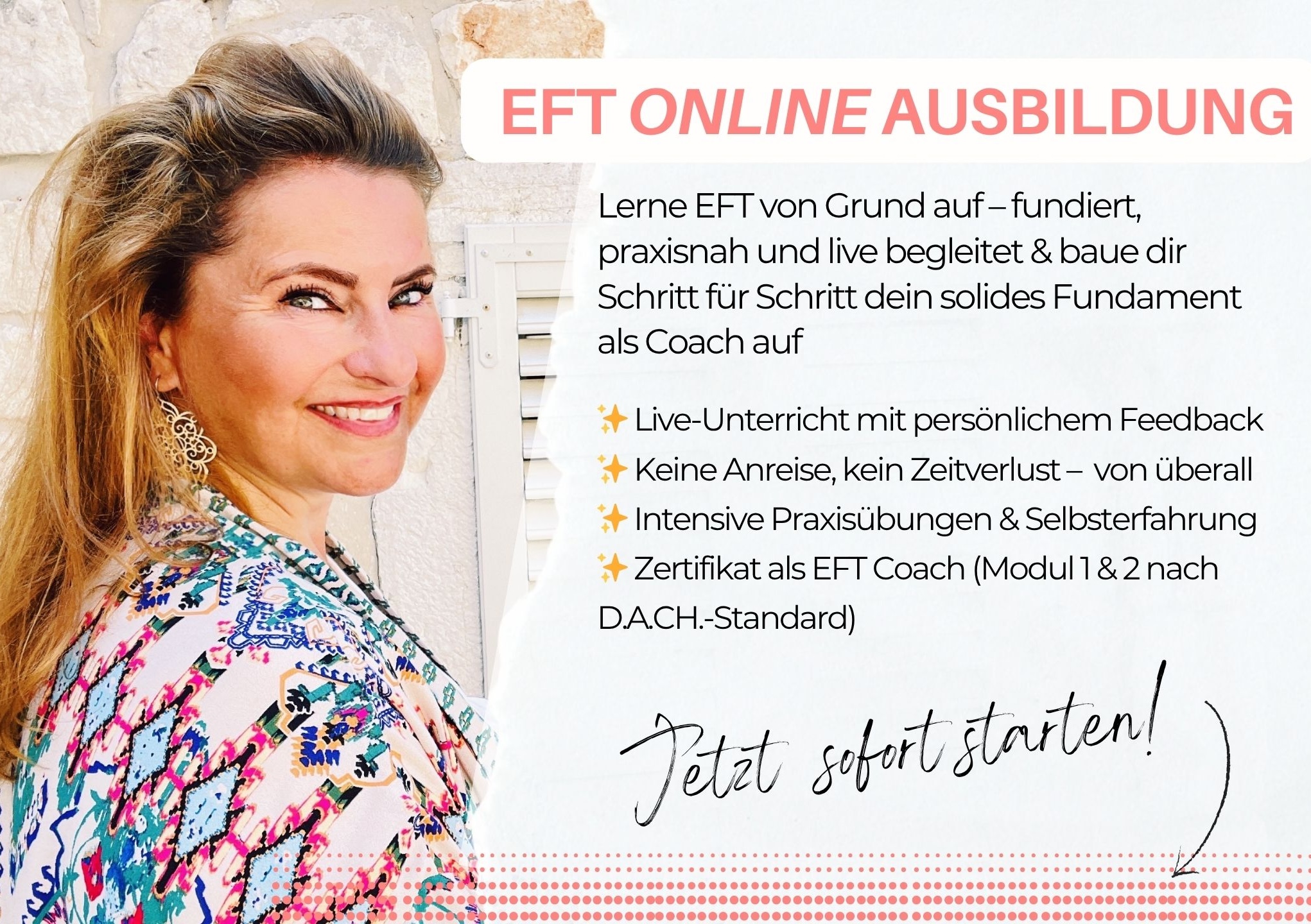 – Zertifikat als EFT Coach (nach D.A.CH.-Verband für Klopfakupressur)Diese Kombination aus Fachwissen, Selbsterfahrung und praktischer Anwendung ist das, was dich zu einem wirklich kompetenten EFT Coach macht.